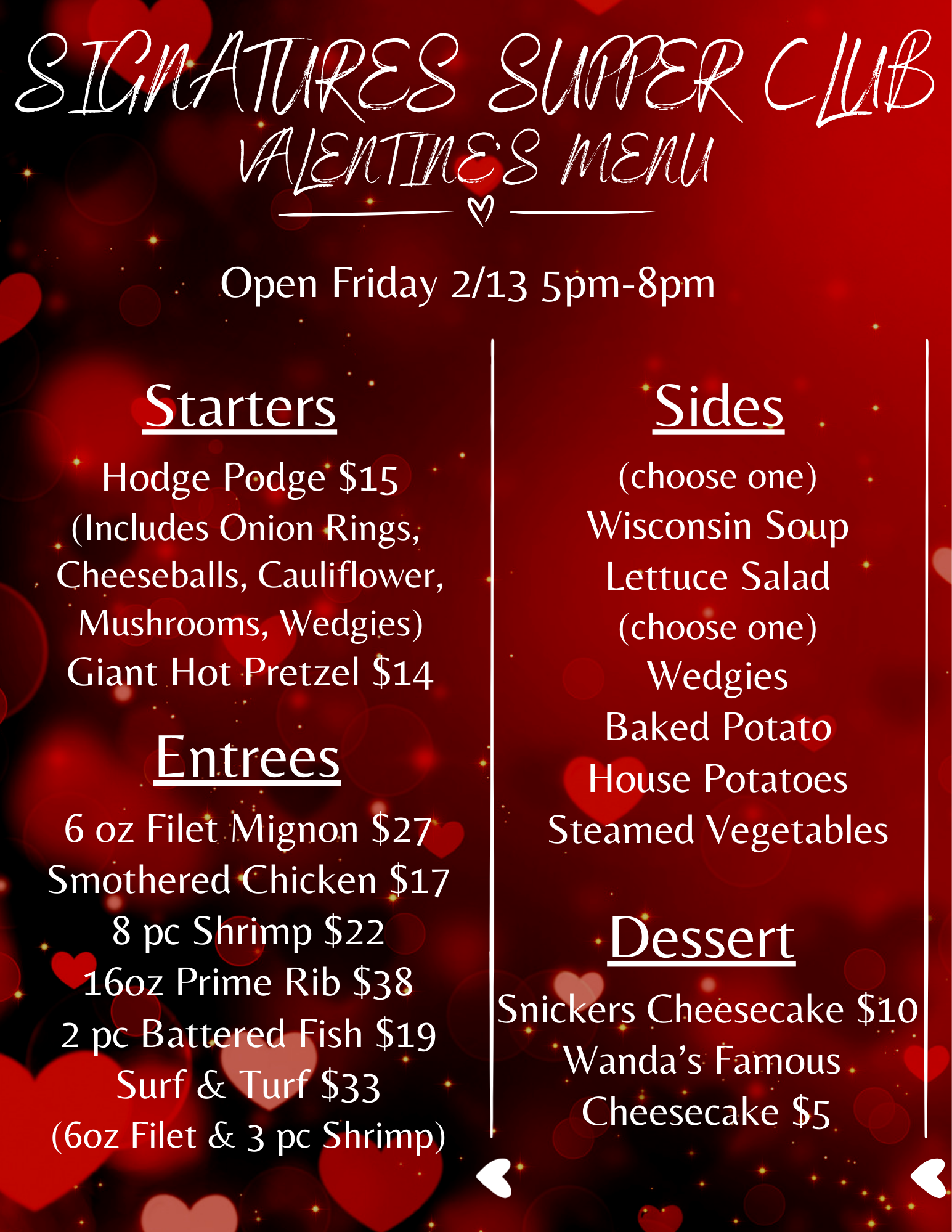 - Valentines Day Specials are below, only open Friday, 2/13! Call 641-324-1052 for Reservations!